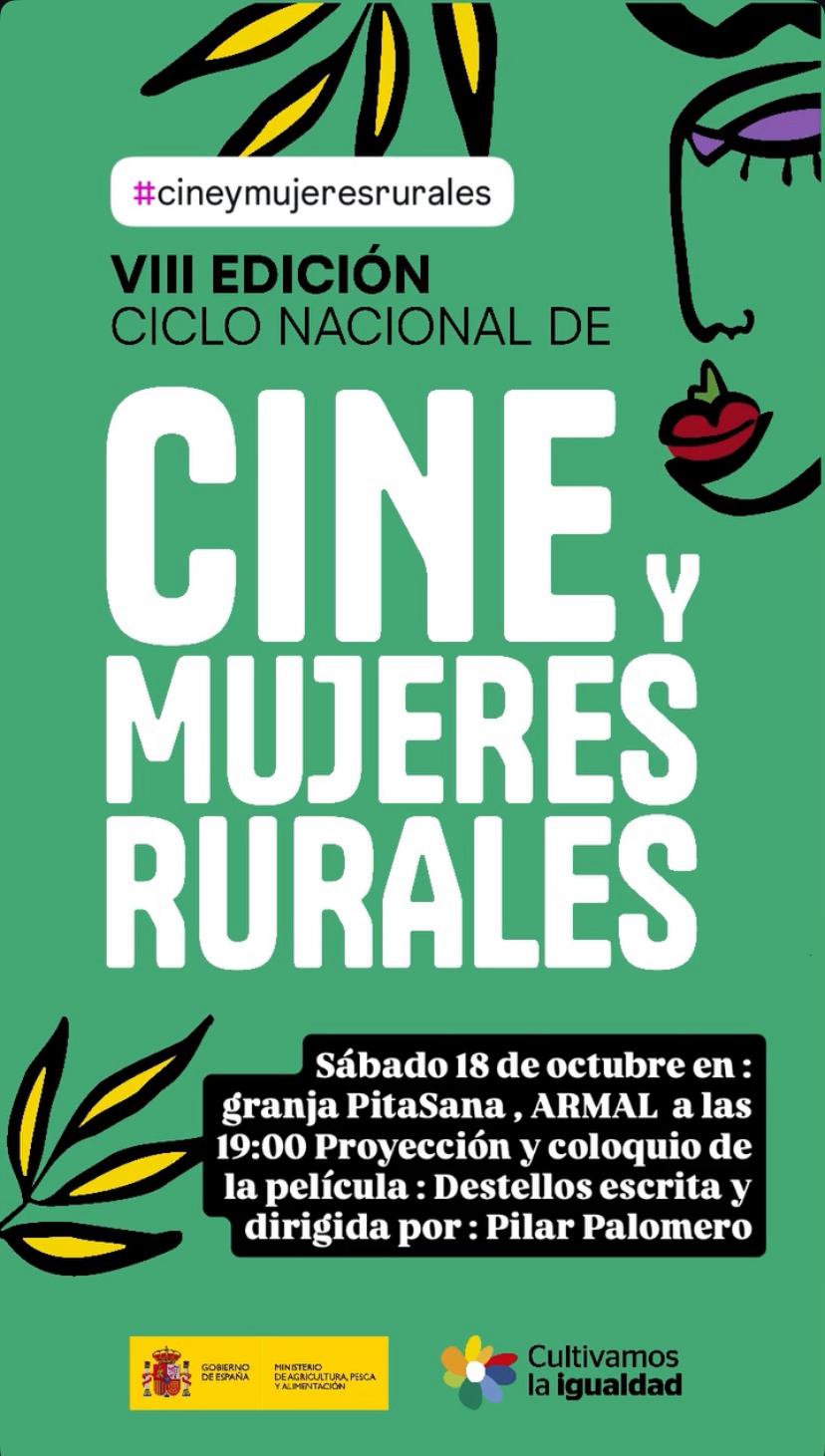 - Sábado 18 de octubre: tarde de cine y mujeres rurales. Proyección de la película: Destellos, de Pilar Palomero. En la Granja Pitasana, a las 19:00 horas.
