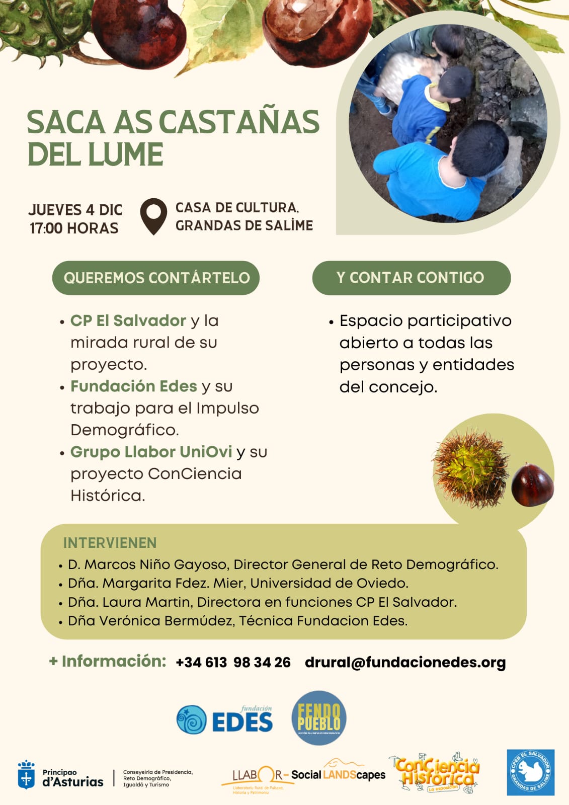 Durante los últimos meses, la entidad desarrolla un proyecto piloto, llamado SACA AS CASTAÑAS DEL LUME, junto al alumnado del CP El Salvador y el Grupo de Investigación Llabor (Universidad de Oviedo), dentro del programa ConCiencia Histórica. A través del conocimiento científico aplicado al castaño, se busca generar una percepción positiva, innovadora y llena de oportunidades sobre nuestro territorio. El mundo rural esconde mucha ciencia, y nuestra juventud debe descubrirla y la hacerla suya.