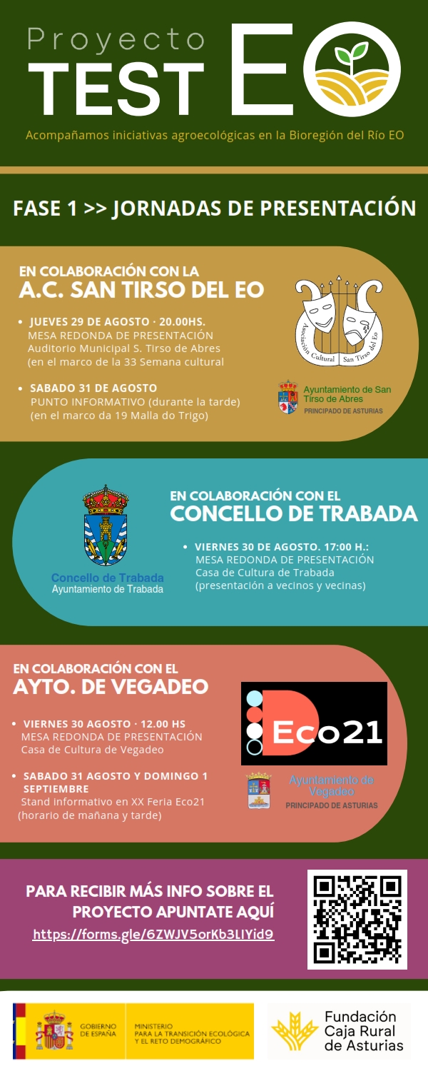 En colaboración con la Asociación Cultural San Tirso del EO, el Concello de Trabada y el Ayuntamiento de Vegadeo, nos complace anunciar el lanzamiento del innovador proyecto "Test_EO", que busca fomentar iniciativas agroecológicas en la bioregión del Río EO. Este proyecto tiene como objetivo optimizar el uso de recursos agrícolas y proporcionar formación y asesoramiento a nuevos emprendedores del sector agroganadero.